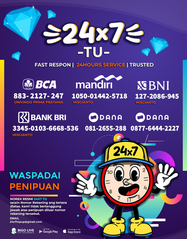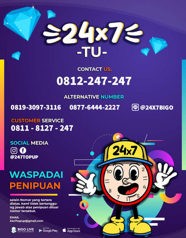 24x7 Top Up adalah salah satu divisi di bawah naungan PT Univindo Prima Pratama yang berfokus pada layanan top up diamond Bigo. Sebagai reseller resmi, kami berkomitmen untuk menyediakan transaksi yang cepat, aman, dan terpercaya.